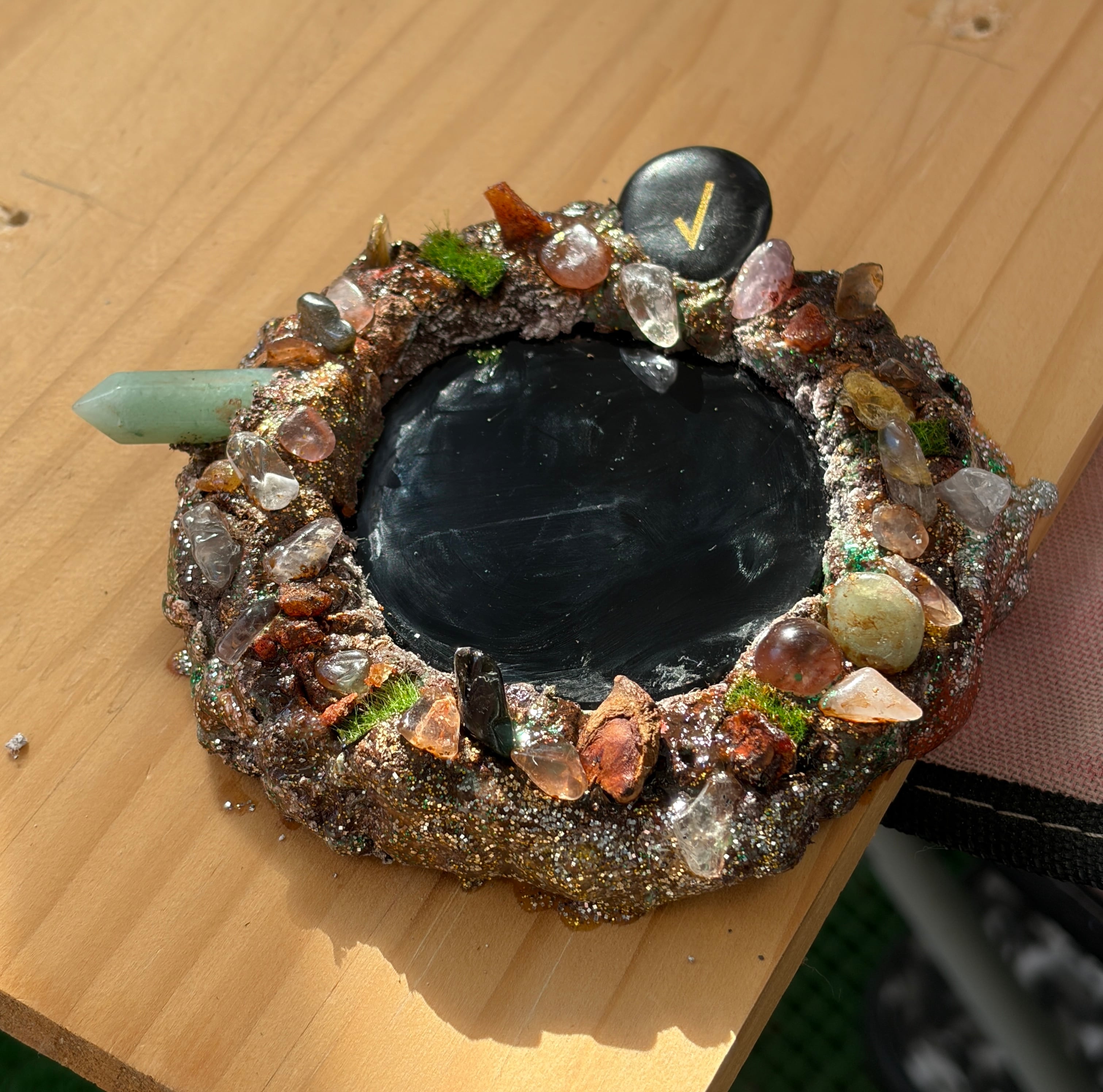 オリジナルの木枠の中へ丸いオブシディアンをはめ込み周りを粘土で固め