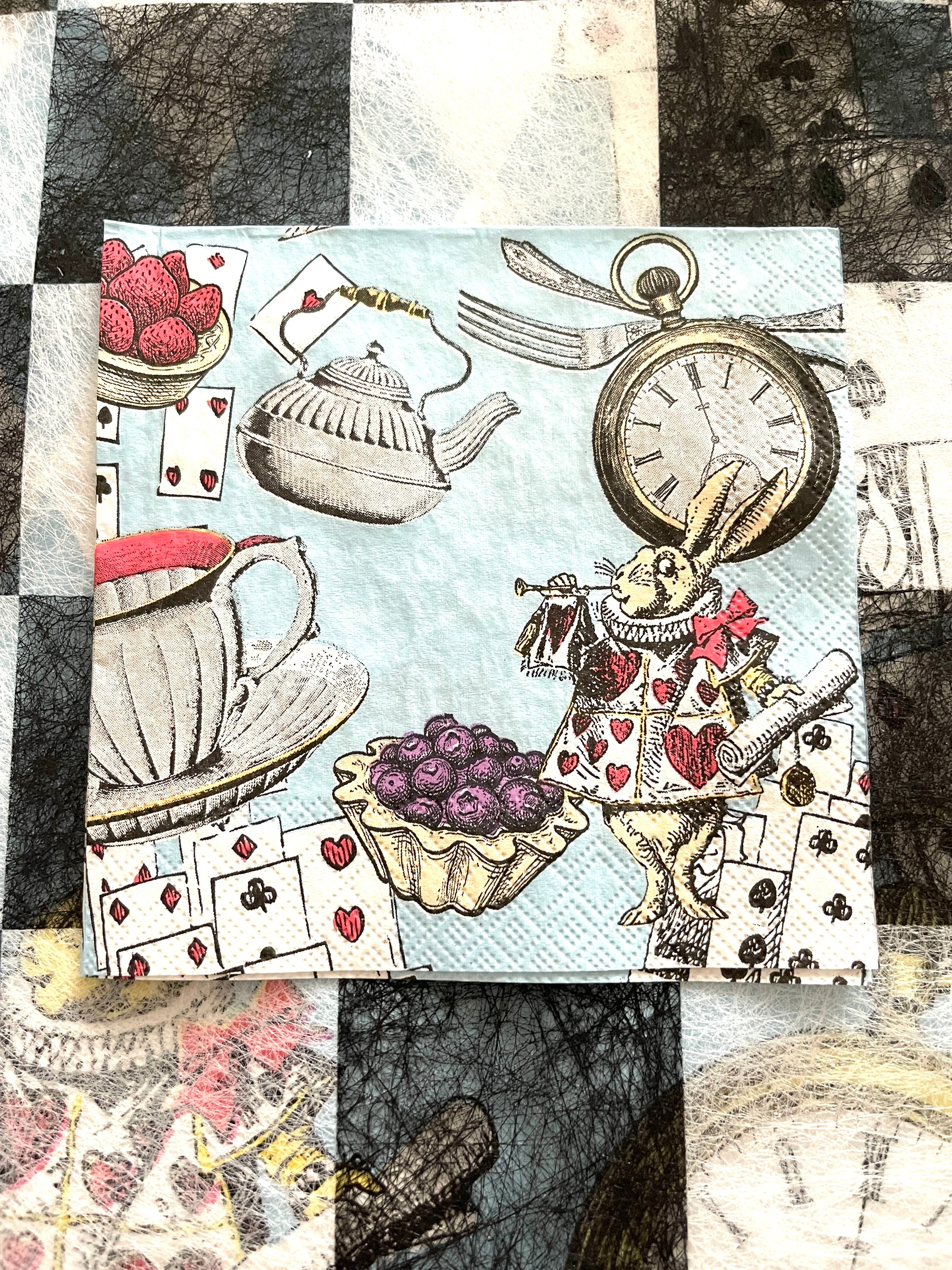 ブルーカラーのアリスとホワイトカラーの絵柄の可愛いペーパーナプキンがありますので